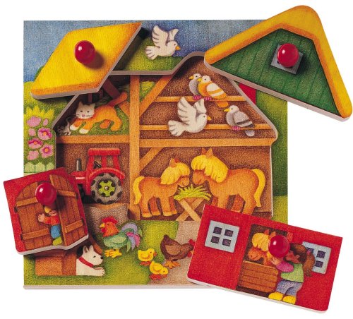 Encourage your toddlers problem solving and fine motor skills with this sturdy peg puzzle from Germany Four pieces can be put together and taken apart from this board revealing the hidden world inside the barn Each piece has a big red knob that is perfectly sized for a young childs hands We Read More..